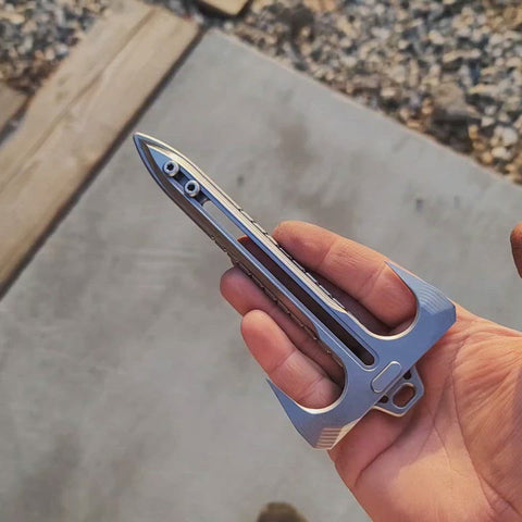 The Axe Quillion is an aggressive medieval dagger with guards inspired from a double ended battle axe. The long sweeping quillion come to points which add to the forward threat when the blade is presented. The dagger's blade offers full length double sided live edges, which become fully protected, eclipsed by the handle when closed. Edged to 1000 grit in wet silicone carbide makes a potent dagger.