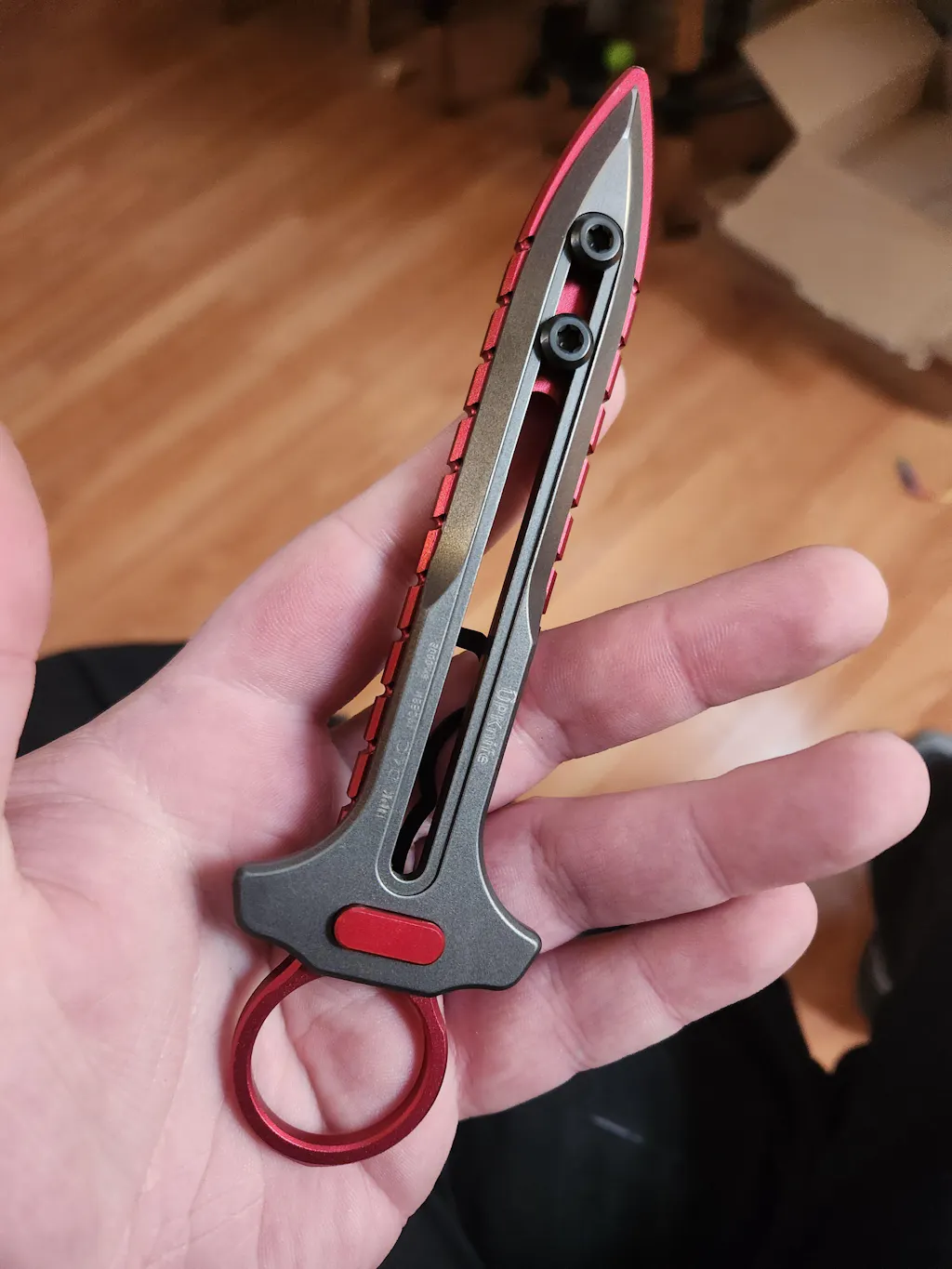 This UPK-D4C Compact Eclipse has a Hardened Stainless Blade on a Type III Hardcoat 7075-T6 Aluminum Ring2 Handle with Clip.